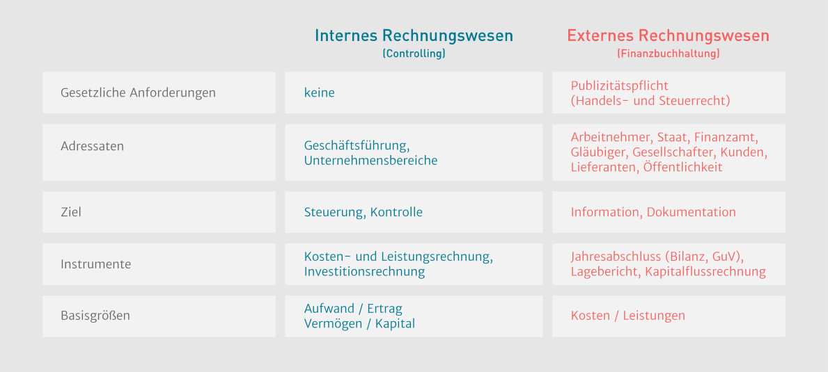 Dagegen ist das interne Rechnungswesen (bzw. Controlling) nach innen gerichtet. Es ist eine wichtige Informationsquelle für die Geschäftsführung oder andere unternehmensinterne Stellen. Es beinhaltet die