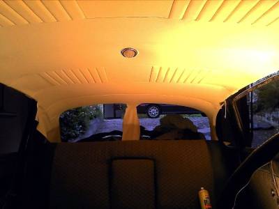 Auf gleiche Weise habe ich mich bis zum kleinen Heckfenster weiter geklebt. Seitlich der B-Säule mußte ich das Material leicht einschneiden. Die Schnitte werden später von der B-Säulen Verkleidung verdeckt. Jetzt ist die Beifahrerseite dran. Von der Fahrerseite strich ich das Leder mit leichten Zug zur anderen Seite hin glatt und verklebte das Ende an der Dachkante, wie auf der Fahrerseite. Danach war der himmel gespannt und faltenfrei.