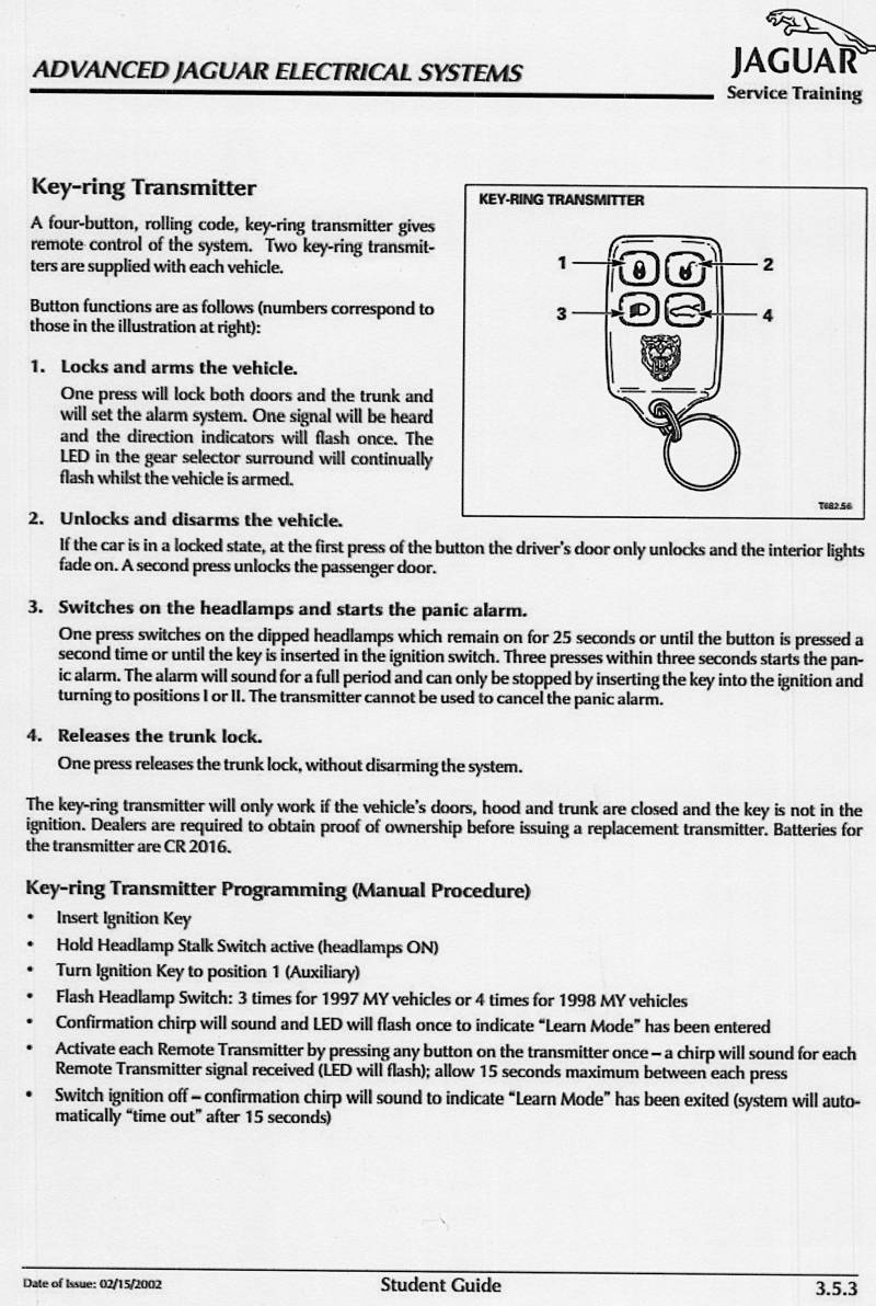 The procedure to program the remote fob or fobs is very simple and should take less than one minute. No tools are required. All remote fobs available must be present when the car is in programming mode, so that they can be programmed at the same time as the new fob. Any fobs that have previously been programmed to the car will need reprogramming at a later date if they are not available when carrying out the following procedure. 1. Enter the car and sit in the drivers seat. 2. Place the key in the ignition. 3. Hold the headlight flasher arm back - the blue “high beam” light will come on the dashboard and the headlights will come on. 4. Keep holding the headlight flasher back and turn the ignition key to position 1. 5. Release the flasher, and then flash the headlights FOUR TIMES. You will hear a “Beep” AND / OR see a small red light illuminate briefly on the Gear Selector on the fourth flash of the headlight - this is to confirm that the car has entered programming mode. 6. Program each transmitter (up to FIVE fobs can be programmed) by pressing any button on the fob. You will hear a “Beep” AND / OR see the red light on the Gear Selector with each press of a button. 7. The car must “Beep” or red light flash five times to complete programming. Therefore, if you are only programming one transmitter you should operate the transmitter 5 times. If you are programming two transmitters you will operate one transmitter twice, and three times on the other. 8. Wait for the car to exit programming - this will be indicated by a final “Beep” AND / OR the red light on the Gear Selector. 9. The remotes are now ready to use. Troubleshooting Q: I have followed the procedure but cannot get my car to make a “Beep” noise. Am I doing something wrong? A: You are probably doing nothing wrong, the problem may be with the alarm siren in the engine bay which produces the “Beep” noise. Sometimes these fail. Continue with the programming procedure as set out above, you should still be able to program the fobs. If you follow the procedure but still cannot program the remote fobs, there may be an internal fault with the Security Locking Module which is preventing the car from entering programming mode. In this case you will need to consult a Jaguar Dealer or Specialist. Q: My car enters Programming Mode in Step 5, but when I go to Step 6 there is no “Beep” or flash of the red light when I press the button on my remote fob. A: There may be a problem with the fob itself or the receiving aerial in the car. There are a few things to try: (i) Ensure the fob is fitted with a good quality, new battery (the battery size is "CR2032" - we recommend Duracell, Varta or Panasonic). (ii) Try holding the fob close to the rear windscreen, at the top center of the glass. This is where the receiving aerial is located. (iii) Check the connections on your Security Locking Module are clean and show no sign of corrosion. The Security Locking Module (SLM) is located inside the boot. To find it, open the boot and remove the battery cover. There is a fuse box assembly next to the battery. Remove the 3 x 10mm bolts holding the fusebox carrier. The SLM is underneath the fuse box carrier. Q: I have programmed the fobs successfully, but when I press the button to lock the car nothing happens! A: This may be caused by a faulty sensor on a door, or the boot or bonnet. Check all these are fully closed, and that there are no warning lights on the dashboard. Q: I purchased a remote fob from a seller in a different country. The lights work when I press the buttons but it does not communicate with my car. A: The remote fobs work on different transmitter frequencies in different parts of the world, for instance U.K and most of Europe use 433mhz, whereas U.S.A and Far East use 315mhz. If purchasing a fob from outside your own country you must be certain that the frequency matches your car requirement.