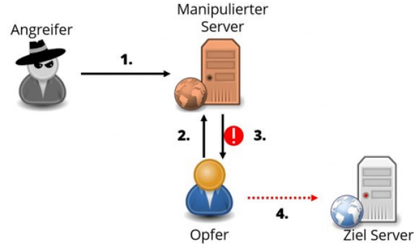 - Das Opfer muss auf eine Seite surfen, die vom Angreifer kontrolliert wird, oder auf einen präparierten Link klicken