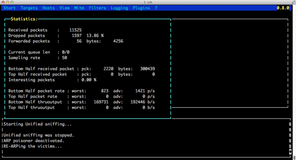 Menü: Sniff - Unified sniffing... Eingabe: eth0 Menü: Hosts - Scan for hosts Menü: Hosts - Hosts list Router in Hosts list markieren und Taste 1 (für Target 1) klicken Ziel (Opfer) in Hosts list markieren und Taste 2 (für Target 2) klicken Hilfe mit SPACE Menü: Targets - Current Targets Menü: Mitm - ARP poisoning ... (ohne Parameters) Menü: View - Statistics Menü: Start - Start sniffing Menü: View - Statistics Opfer PC sieht nun "falsche" MAC vom Router, siehe arp -a auf Opfer PC