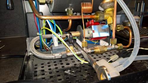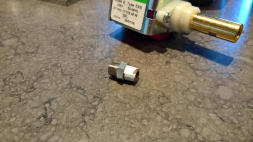 Wie ihr oben seht ist die neue Pumpe noch nicht eingebaut. Schraubt das Verbindungsstück mit euren Schraubenschlüsseln bereits außerhalb der Espressomaschine fest in die neue Pumpe. So erspart ihr euch nachträglich ein nerviges Einschrauben des Verbindungsstücks im Inneren der Maschine.